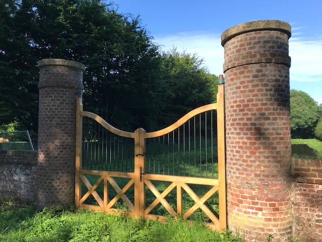 Fabrication dans notre atelier d'un portail bois et métal à Ermenouville. Bois exotique en forme de chapeau de gendarme inversé. Barreaudage métallique.