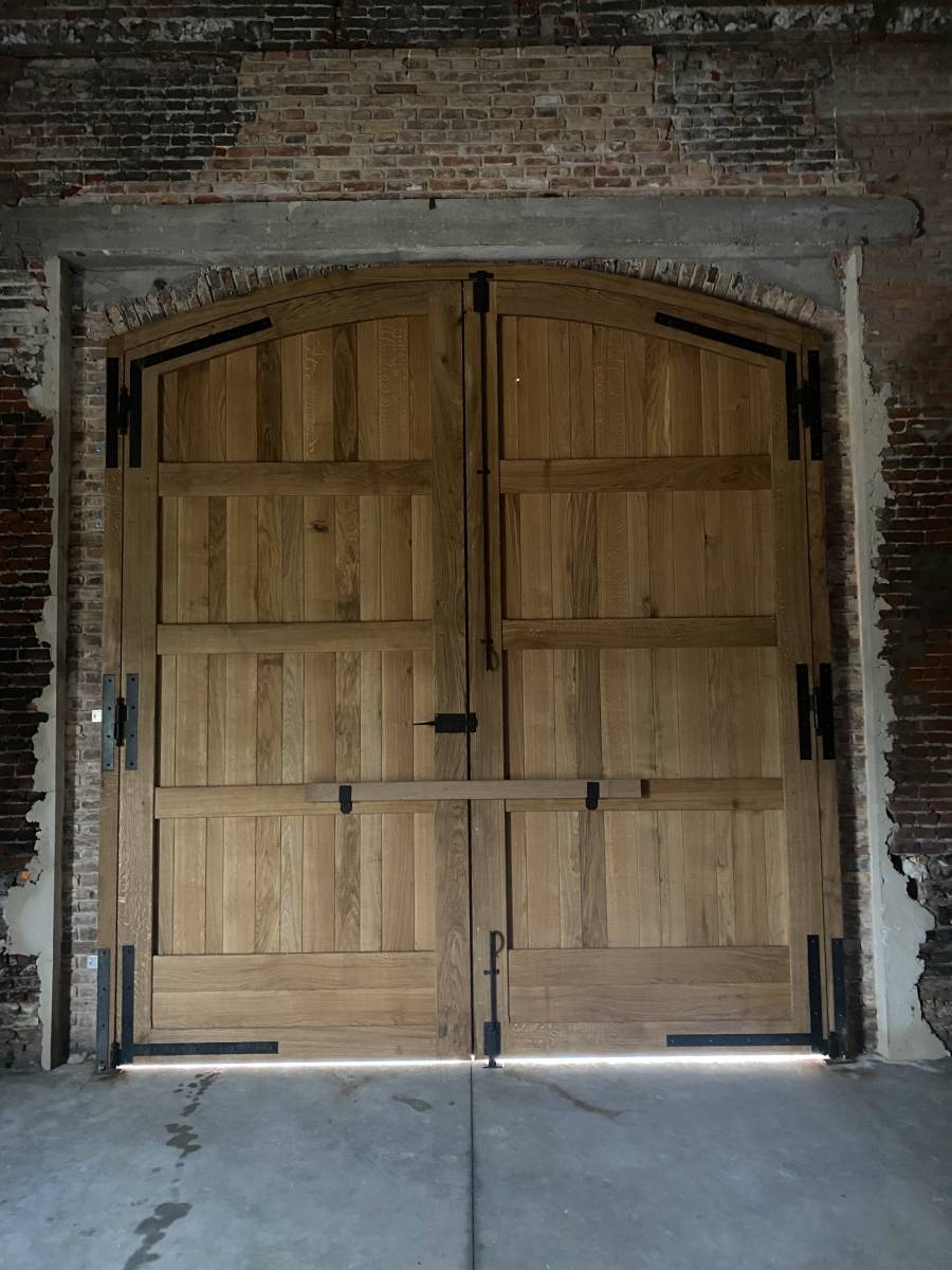 Fabrication dans nos ateliers d'une porte en chêne massif, posée sur un bâtiment classé à Saint-Valery-en-Caux. Ossature et frise chêne. Clous en fer forgé à l'ancienne.