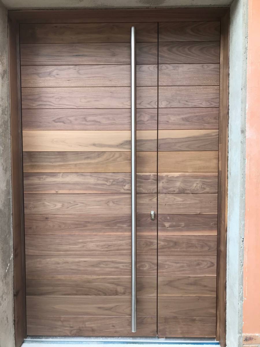 Fabrication en atelier d'une porte d'entrée en noyer d'Amérique massif, barre de tirage, serrure 3 points, bâti noyer également.