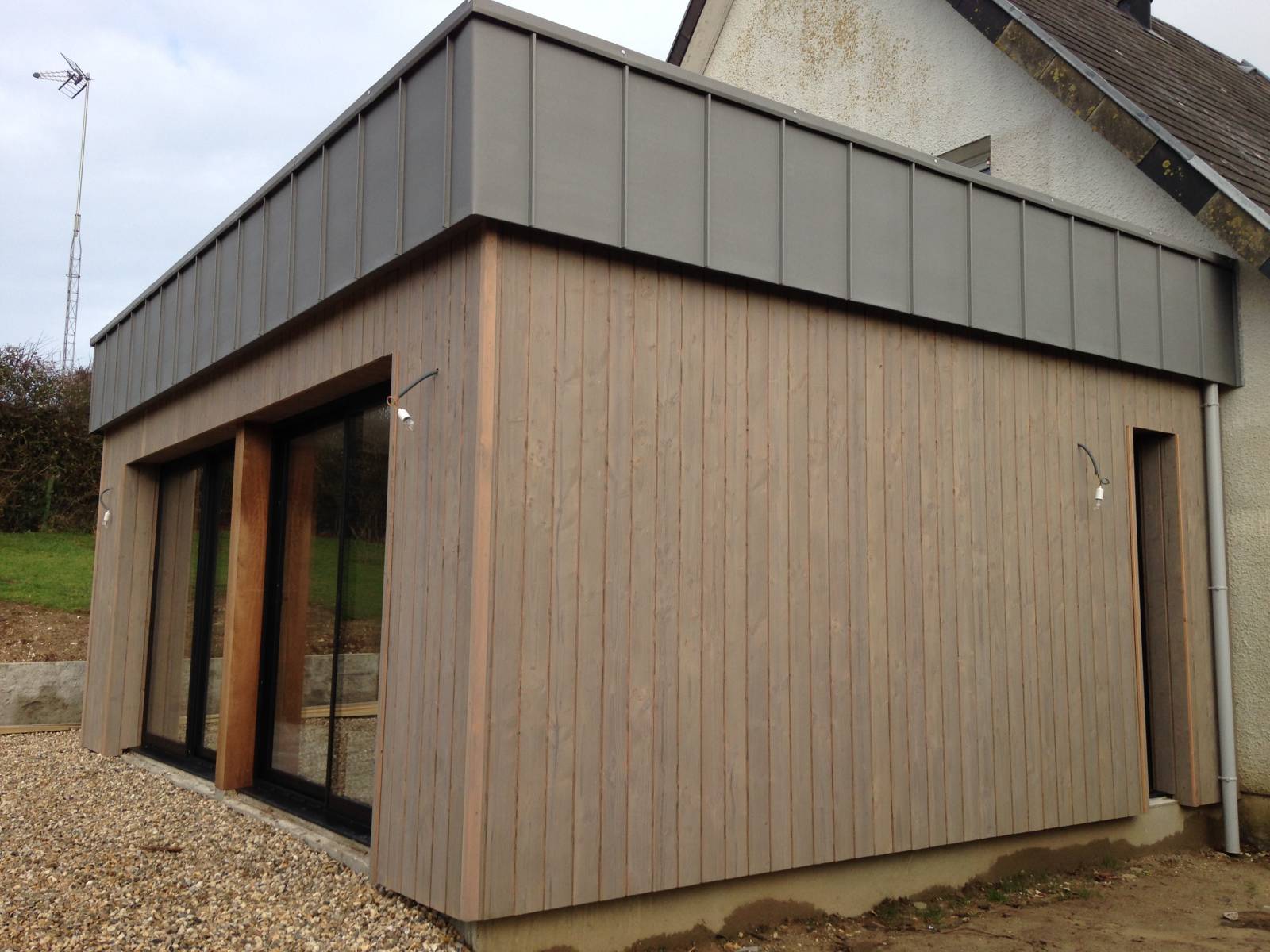 Ci-contre, conception et réalisation d'une extension type "cube" à Saint-Valery-En-Caux 76, contemporaine, avec de grandes baies donnant sur le jardin et un toit plat Pilotage du chantier par l'Entreprise Carpentier.