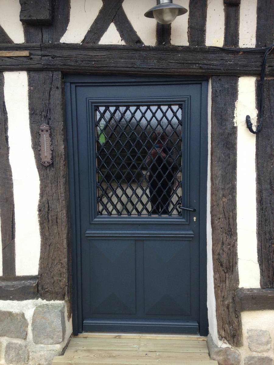Ici, remplacement d’une porte d’entrée vitrée en bois massif proche de Fauville-en-Caux. Réemploi d’une grille en fonte ancienne provenant de notre stock qui a pu être installée après sablage et grenaillage.